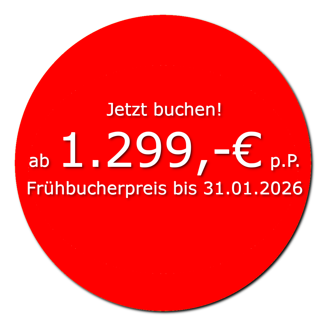 Sichert euch JETZT eure Traumreise bis zum 31.01.2026 zum Frühbucherpreis, das Buchungskontingent ist limitiert und sehr schnell vergriffen!