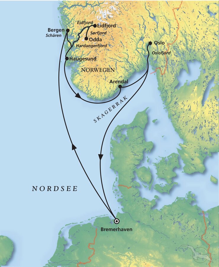 Routenverlauf: Bremerhaven – Einschiffung, Urlaub auf See, Vik / Norwegen, Kreuzen im Schären, Bergen / Norwegen, Odda / Norwegen, Kreuzen im Sør-& Eidfjord, Eidfjord / Norwegen, Haugesund / Norwegen, Arendal / Norwegen, Kreuzen im Oslofjord, Oslo / Norwegen, Erholung auf See, Bremerhaven – Ausschiffung